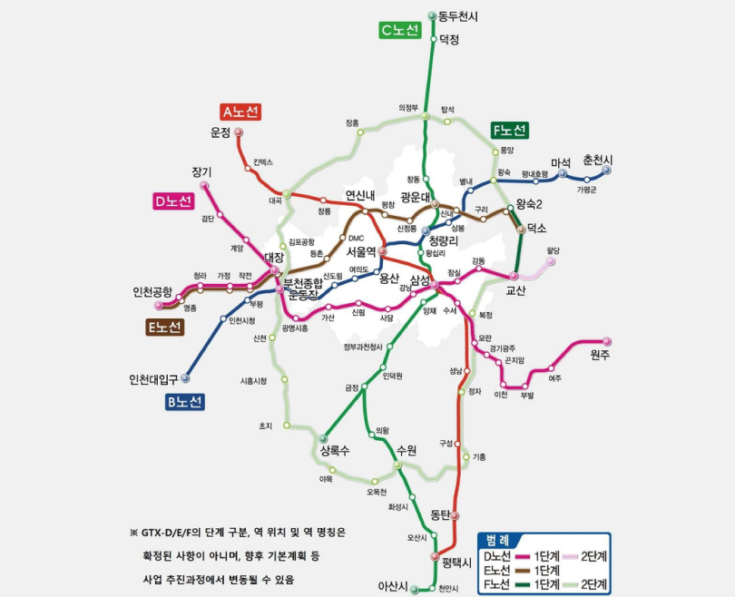 GTX-D,E,F의 단계 구분, 역 위치 및 역 명칭은 확정된 사항이 아니며, 향후 기본 계획 등 사업 추진과정에서 변동될 수 있습니다. (출처: 국토교통부)